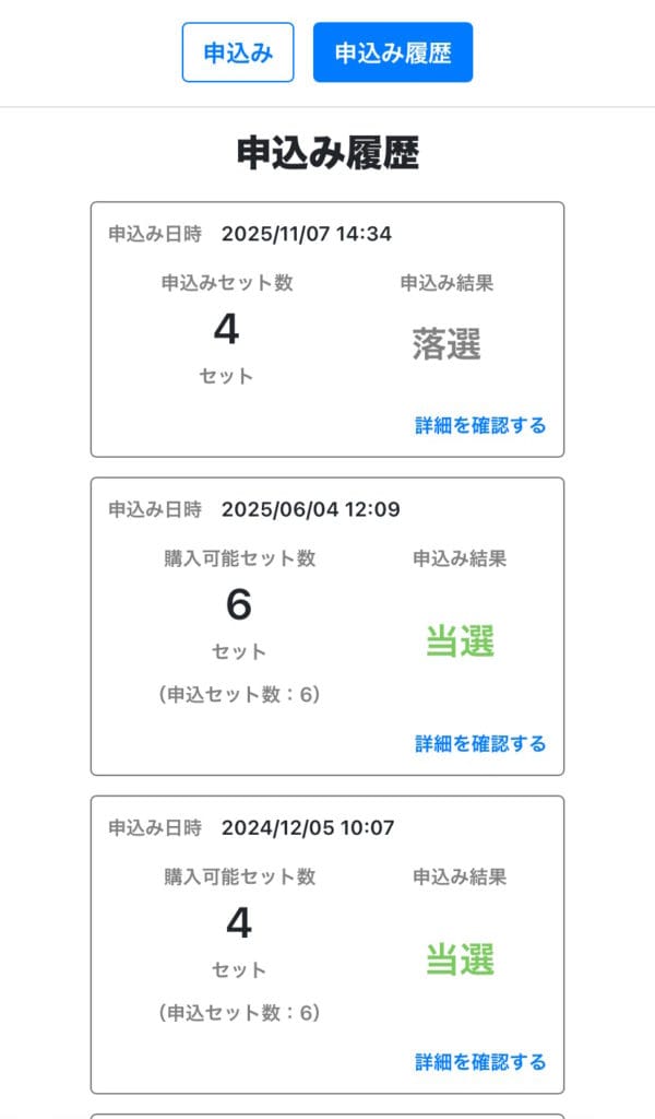 全部が当たるわけではないですが、最近の体感だと およそ50%前後 で当選している気がします。